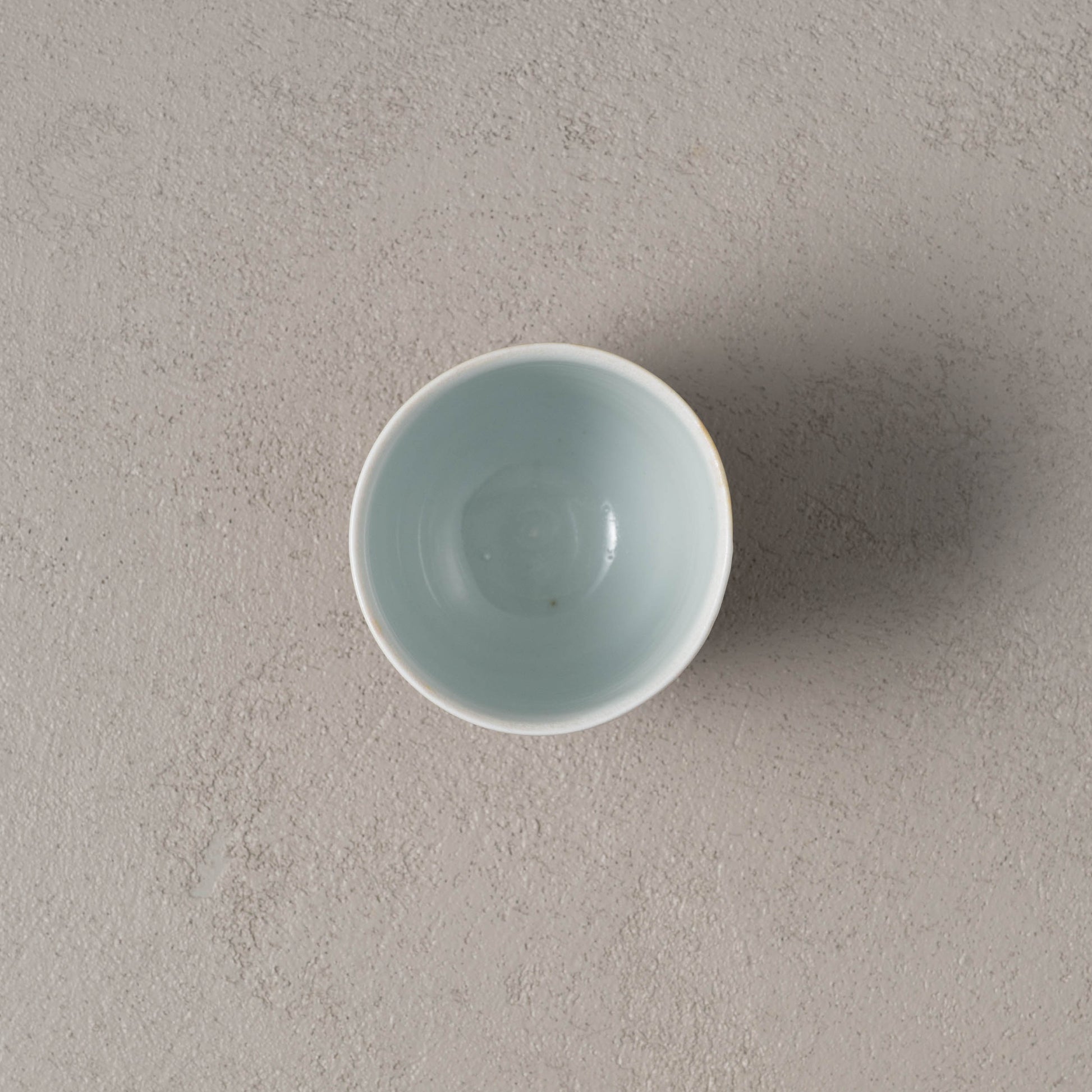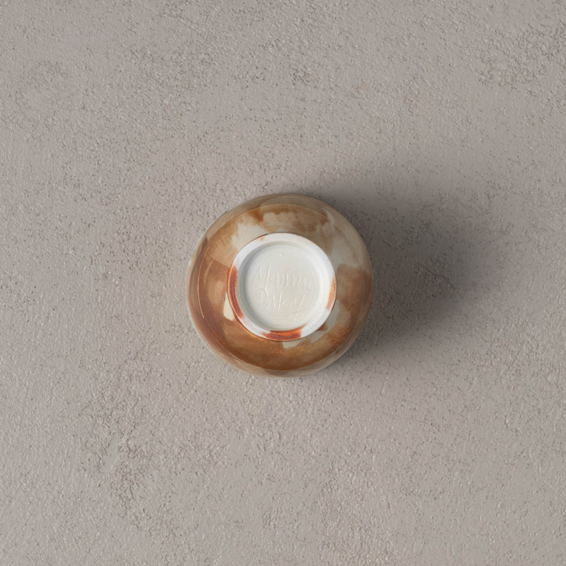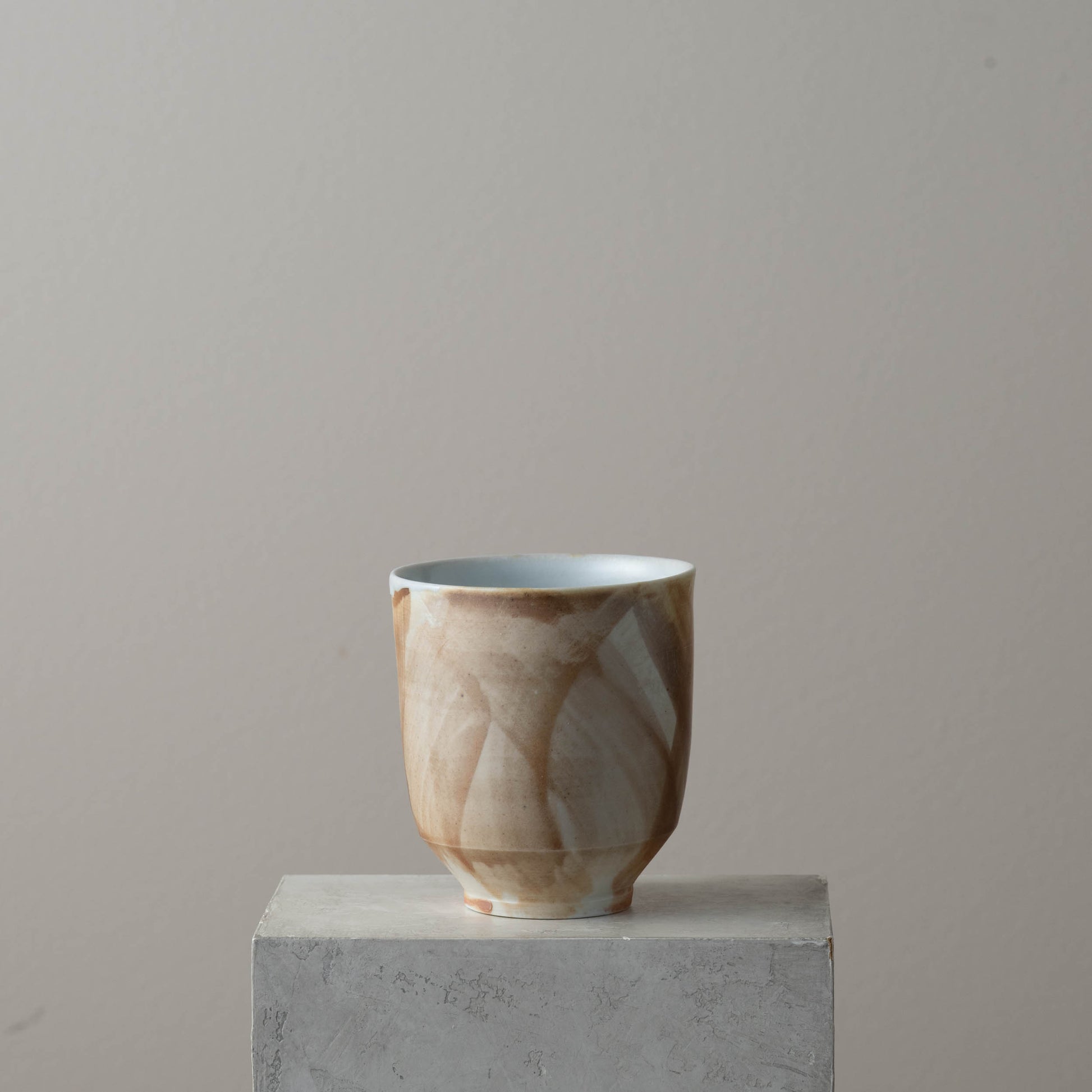 Wheel thrown porcelain yunomi. Decorated with red flashing slip, ash, flame, and salt on the outside and finished with a clear glaze on the inside. A lovely drip detail.